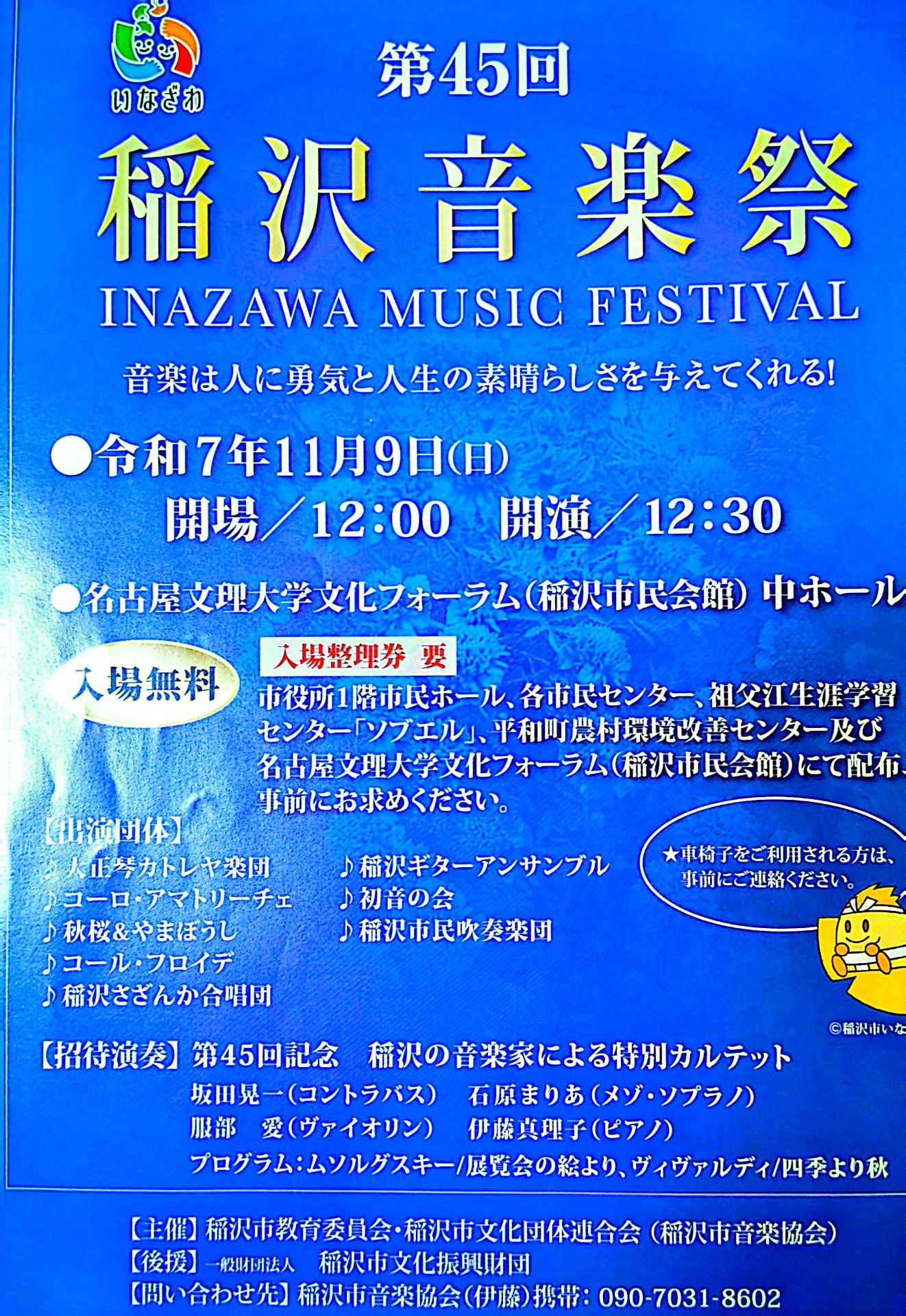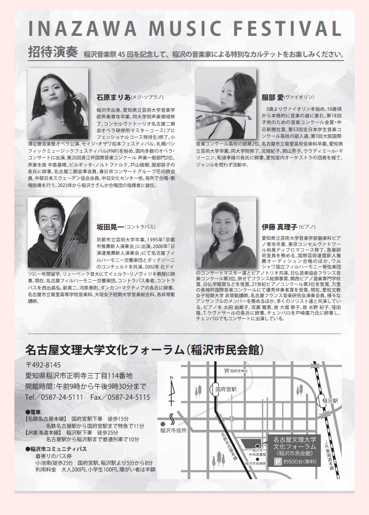 市民音楽祭45回目を記念しまして、名フィルコントラバス奏者の坂田氏プロデュース、稲沢市出身の奏者達による演奏です。